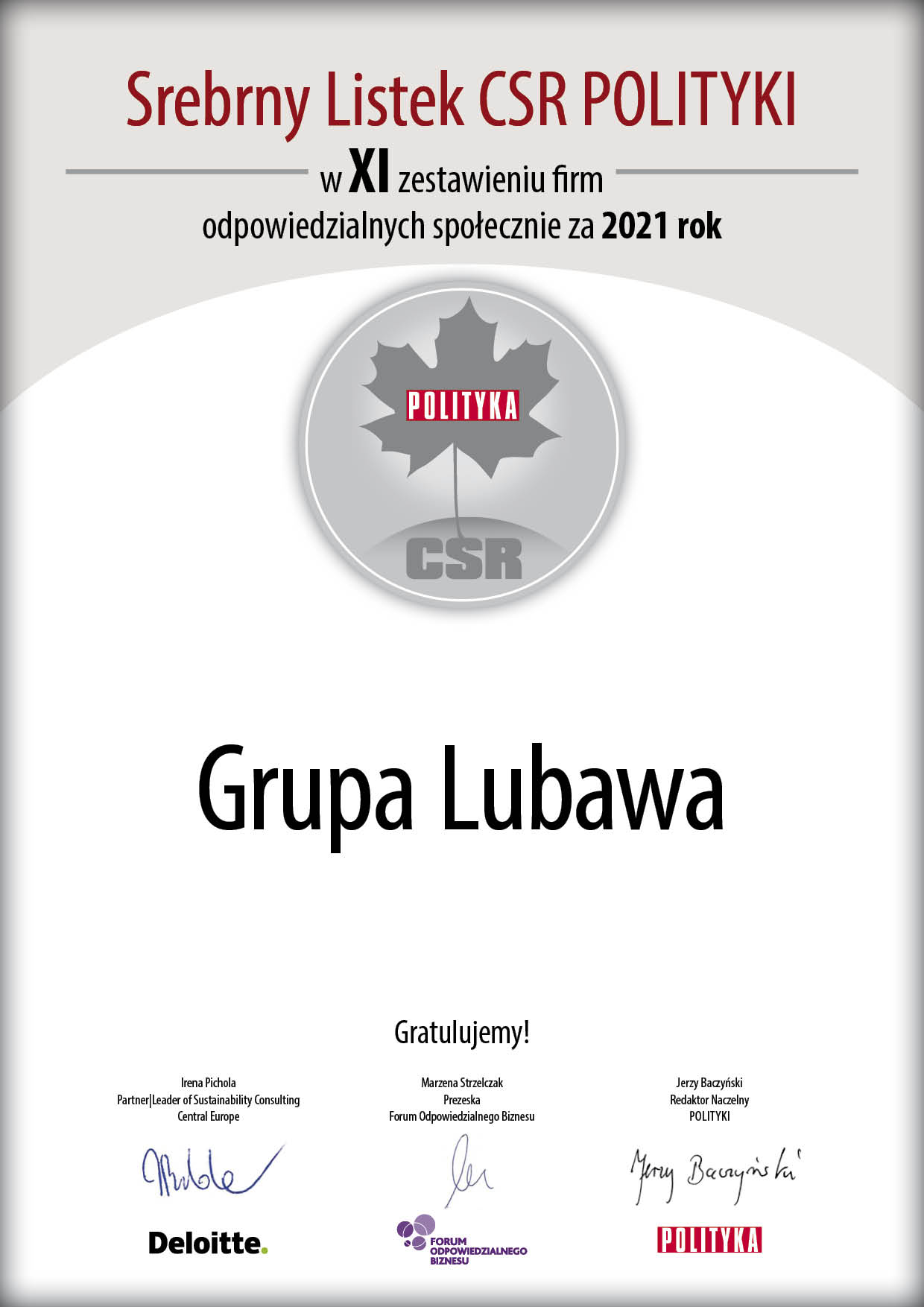 Po raz XI Tygodnik Polityka we współpracy z firmą doradczą Deloitte oraz Forum Odpowiedzialnego Biznesu był współorganizatorem przeglądu rozwiązań firm wspierających zrównoważony rozwój i zaangażowanie społeczne. W tegorocznej edycji uczestniczyła również Grupa Lubawa, która otrzymała nagrodę Srebrnego Listka CSR Polityki.